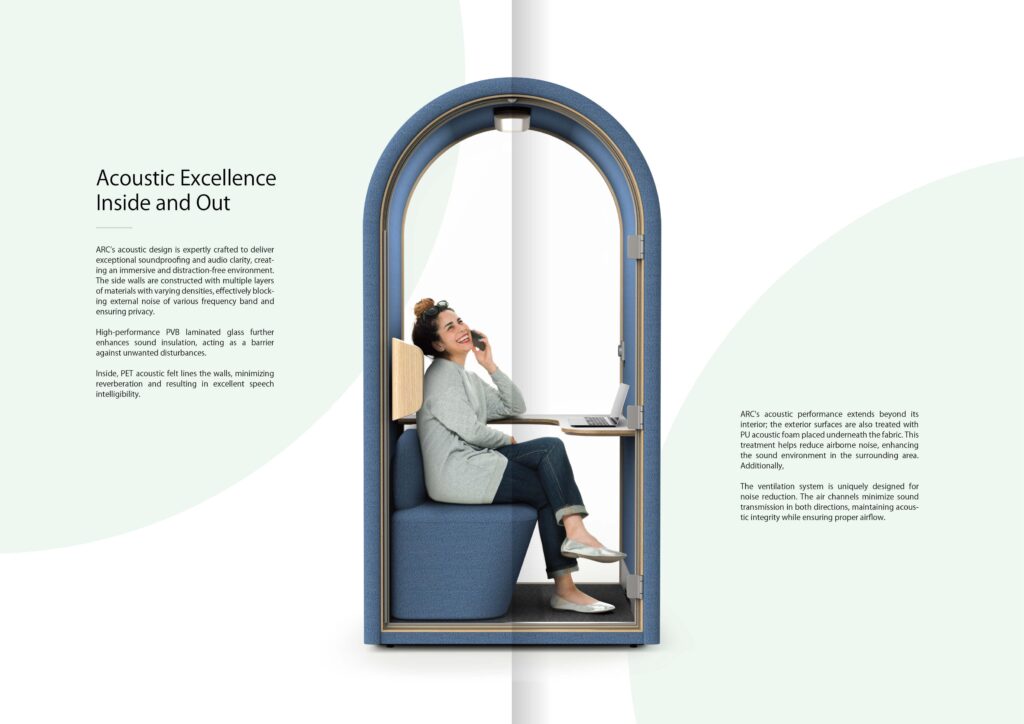 The ARC Pod is not just a workspace; it is a carefully crafted solution that combines cutting-edge soundproofing technology, elegant design, and sustainable materials to enhance your work experience.