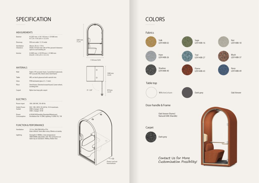 The ARC cabin is not only functional, but also a statement of style. With 9 exterior color options and 9 interior color options, offering over 81 unique combinations, you can customize the cabin to seamlessly blend with your office aesthetics. Its clean, minimalist design and soft, soothing tones create a warm, modern yet timeless atmosphere. Reinforced glass doors allow natural light to flood into the space, while motion-sensing LED lighting and an advanced ventilation system ensure comfort during extended use. From ergonomic layouts to intuitive control systems, every detail is designed to enhance your work experience.