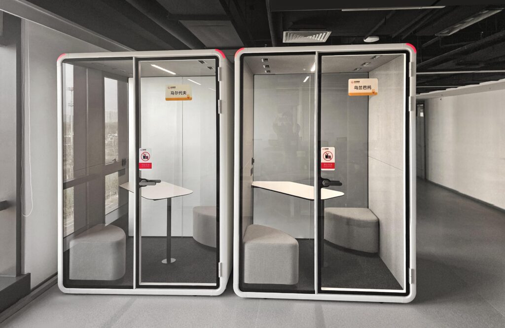 The installation was completed within a few hours, turning the previously noisy corner into two efficient and private micro workspaces.