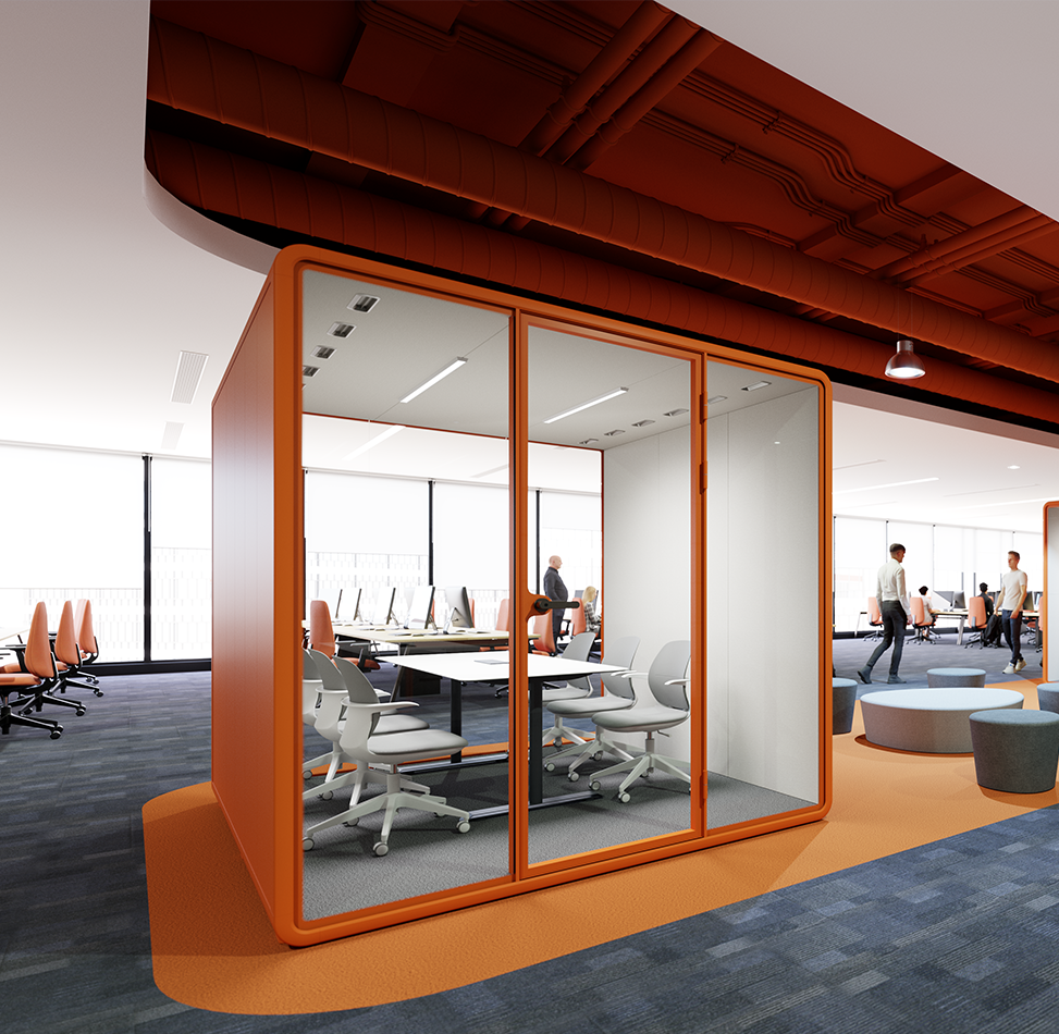 Model XL is a highly adaptable and spacious meeting room of 2.6m*2.6m, comfortably accommodating up to six individuals.its strategic positioning near the workstation area ensures quick and